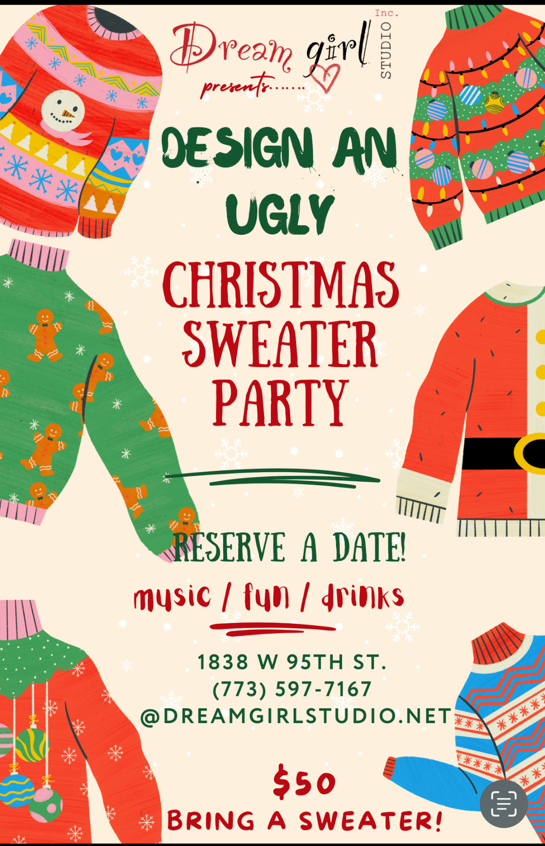 It’s the Holiday Season! Let’s do something creative & different! Book an Ugly Christmas Sweater Party! It’s great for staff, friends, families, church groups and whoever enjoys a good time!