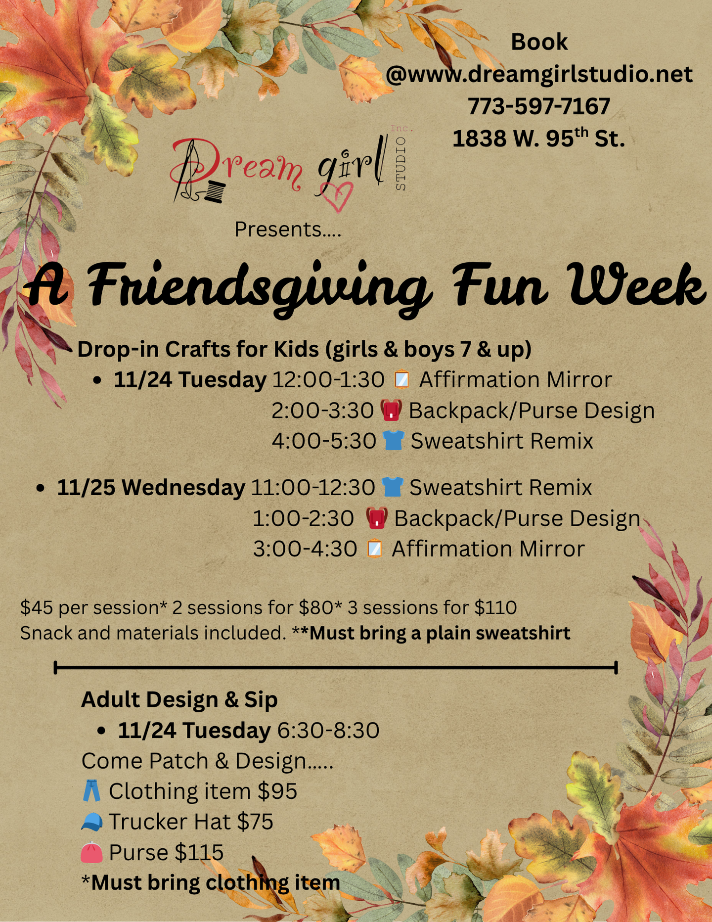 Join us for hands-on fun at Dream Girl Studio, where kids can design, decorate, and express their unique style. Each 90-minute session includes all materials, a light snack, and guided instruction.